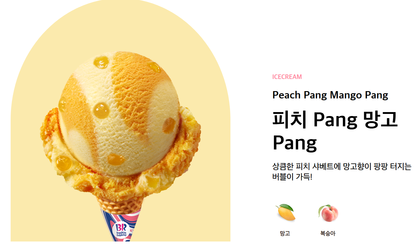 ‘피치 Pang 망고 Pang’은 부드러운 피치 샤베트에 입안에서 톡톡 터지는 망고향 버블이 들어간 플레이버입니다.