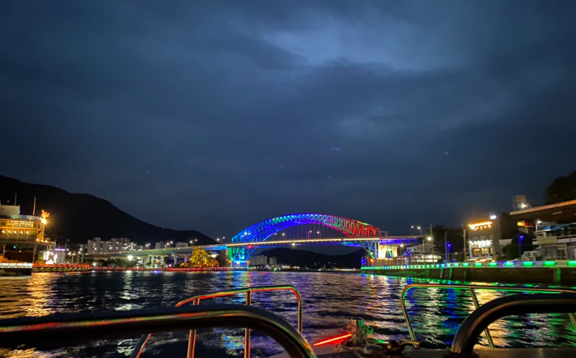 - 통영대교 하단 통과 구간: 조명이 물결에 반사되어 마치 별빛이 떨어지는 듯한 장관 연출